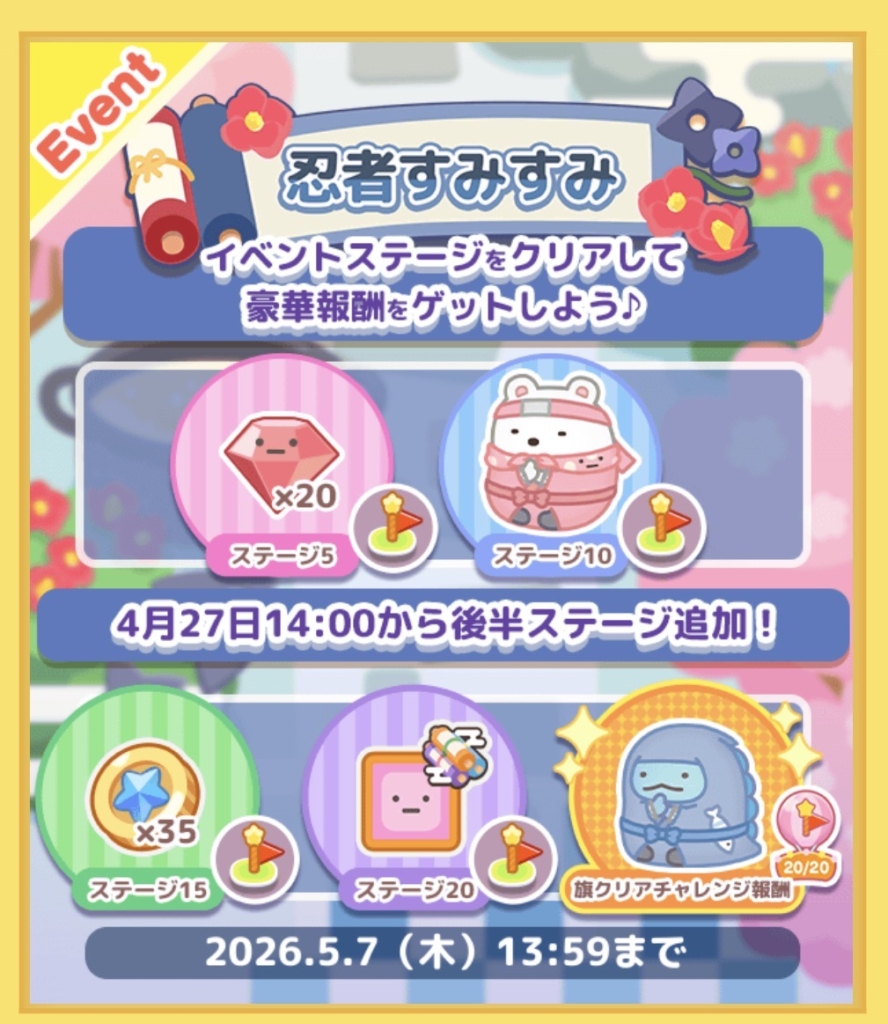 「忍者すみすみ」はGWに開催されているステージイベントで、ステージを進めていくと忍者に扮した限定すみをゲットすることができます。