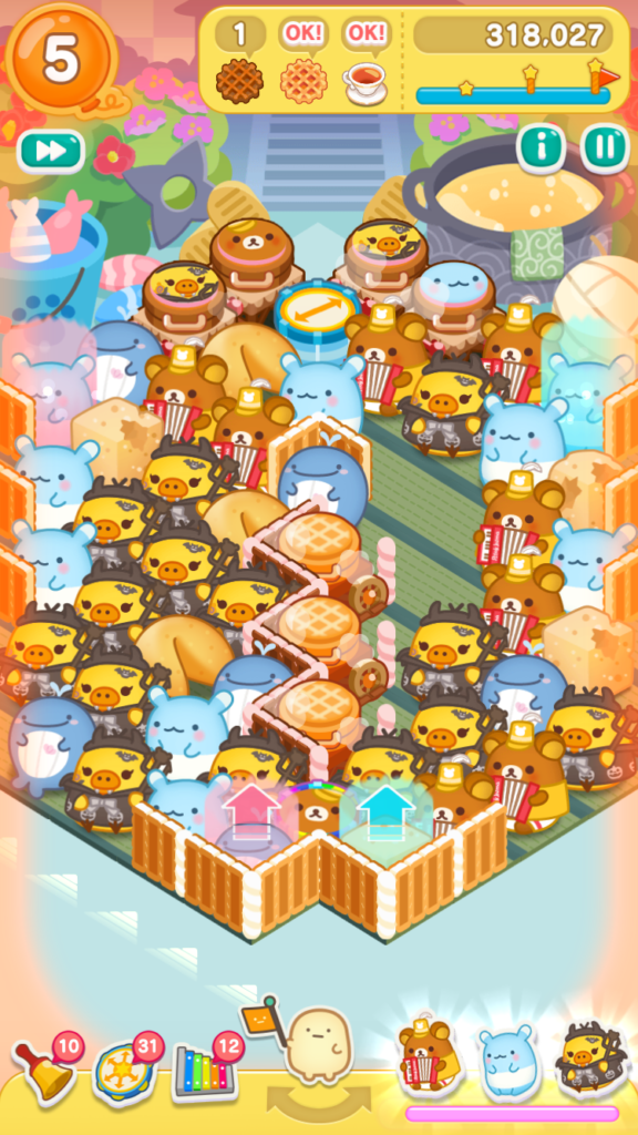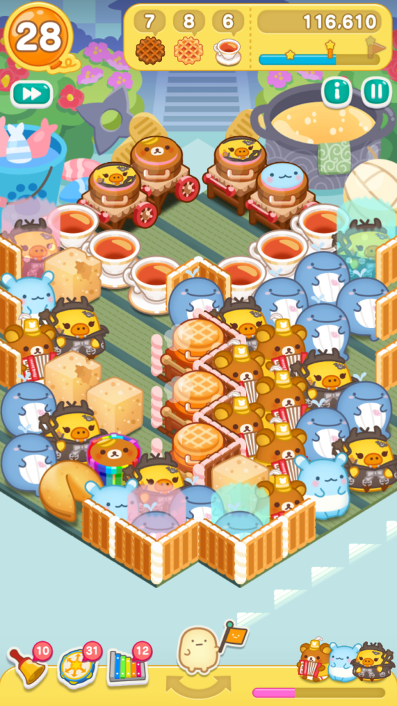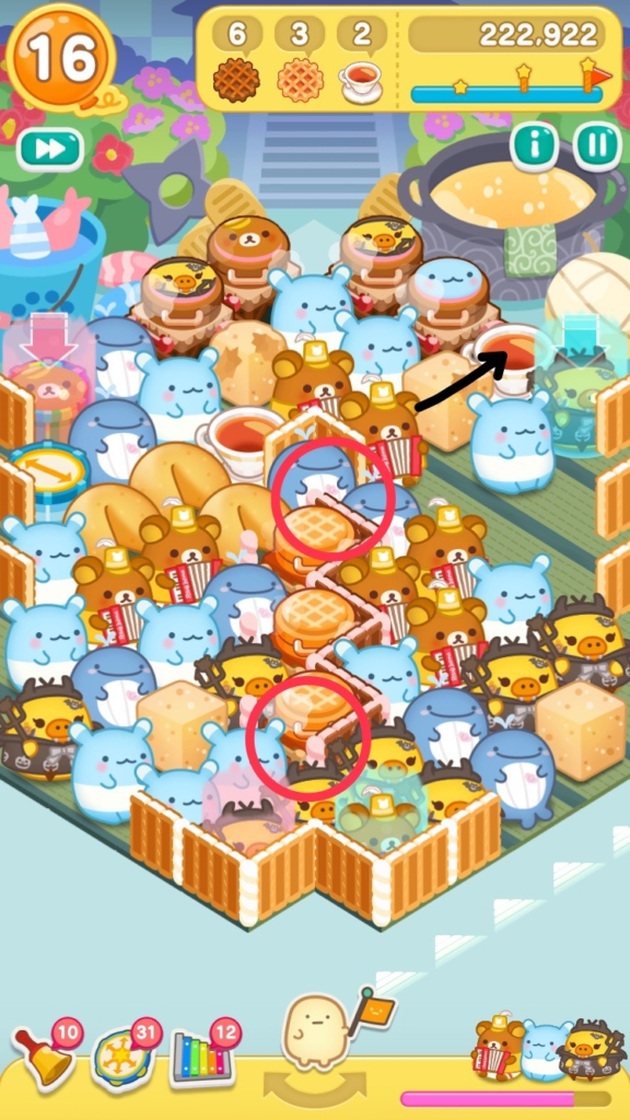 ティーカップが片付いたら、「すみが増える」「集まる」などのとくぎを利用して、ココアワッフルを片付けていきましょう。