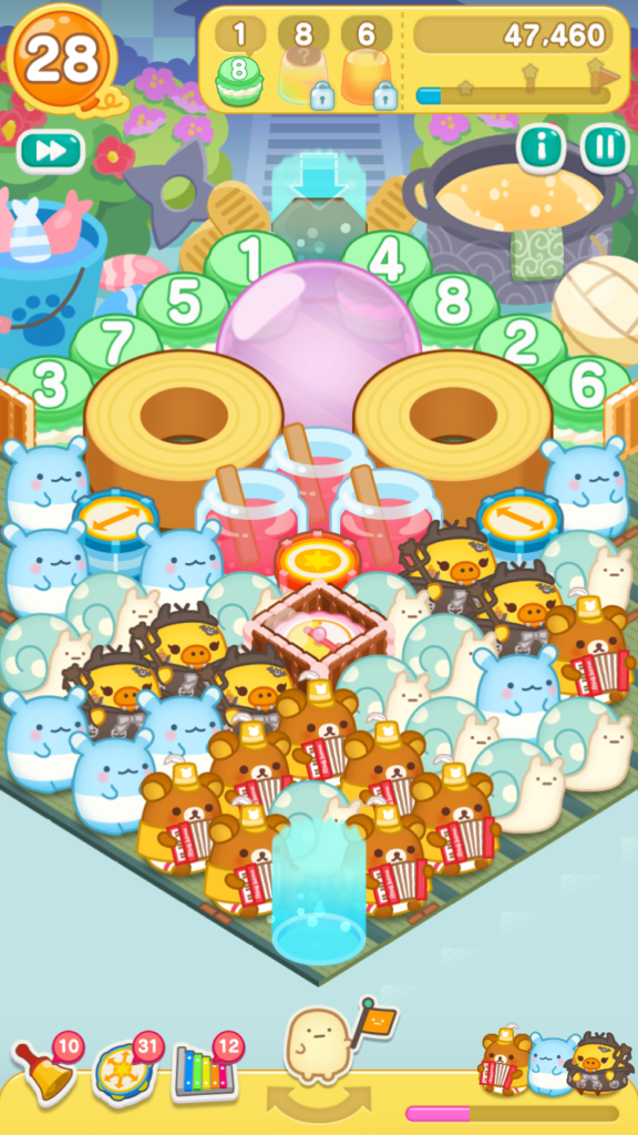 ナンバーマカロンを片付け終えると計13ターン分のバルーンが降ってきますが、似顔絵ゼリーにターンを残したいのでドラムを使用し手早く進めましょう。